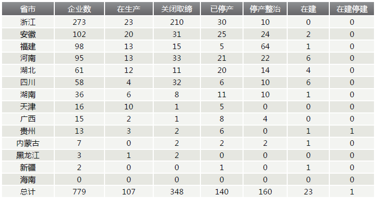 月末,在生产企业共有107 家,约占公布总数的13.74%;关闭取缔348 家,约占公布总数的44.67%;已停